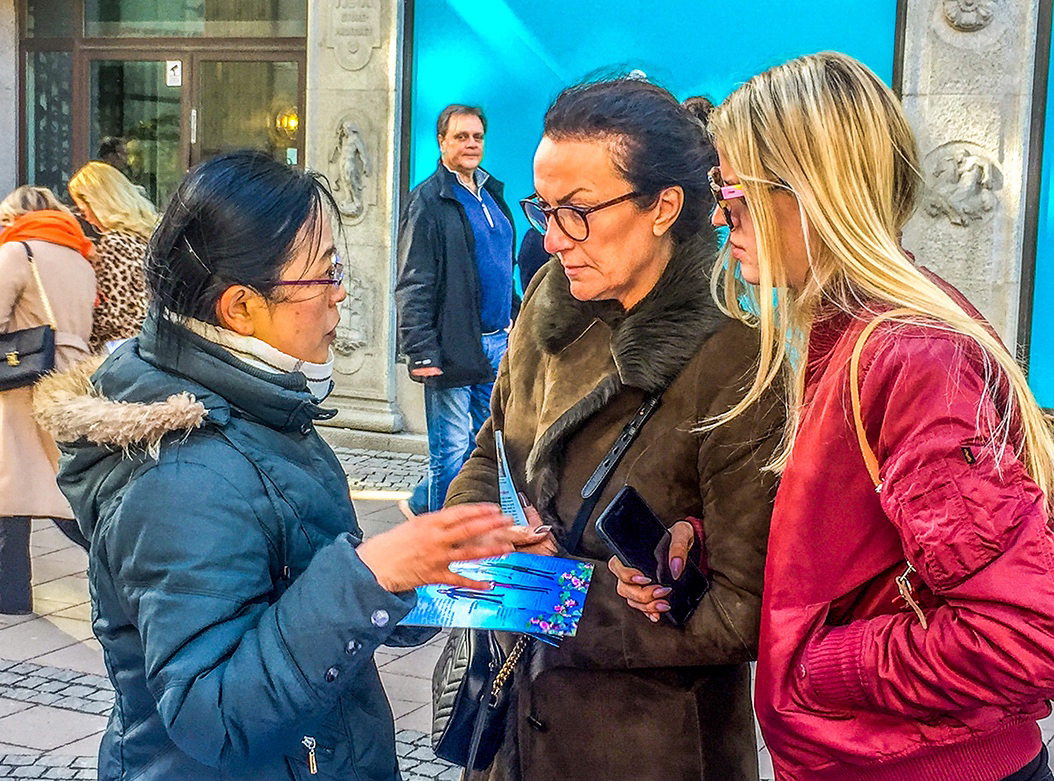 这个周五,三月二十四这天,天气格外的晴朗。法轮功学员又来到这里举办信息日。穿着红色羽绒服的玛丽亚(Maria)站在活动场地前,久久不愿离去。听完了真相后,她对学员说:“这个音乐(炼功音乐)太美了,我的脚感觉是被吸在这里了,都不想走了。中共如此惨烈迫害这些好人,简直是失去了理智!现在我站在这儿感觉很舒服,我需要所有有关法轮功的资料,我要学这个功。”她在制止迫害征签簿上签名后,详细打听了附近炼功点的时间和地点。她得到了介绍法轮大法的信息传单和所有的真相资料后,才满意地离开。