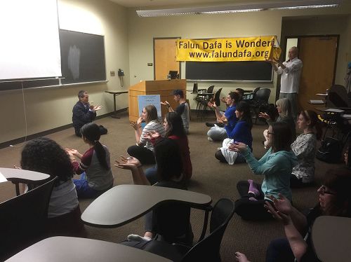 包括两名教授在内,每个人自始至终都学得非常认真,动作也比较到位。炼功时有些人感受到能量。特别有点令人惊讶的是,学炼第五套功法时,有两位女生一上来就可以双盘打坐。整个学功活动持续了一个小时,没有一个人中途停下来。