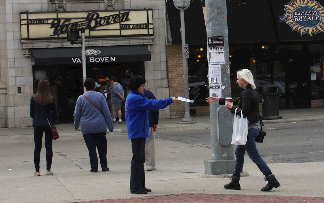 四月二日星期天下午大底特律地区法轮功学员在密西根大学安娜堡市派发法轮功真相传单。