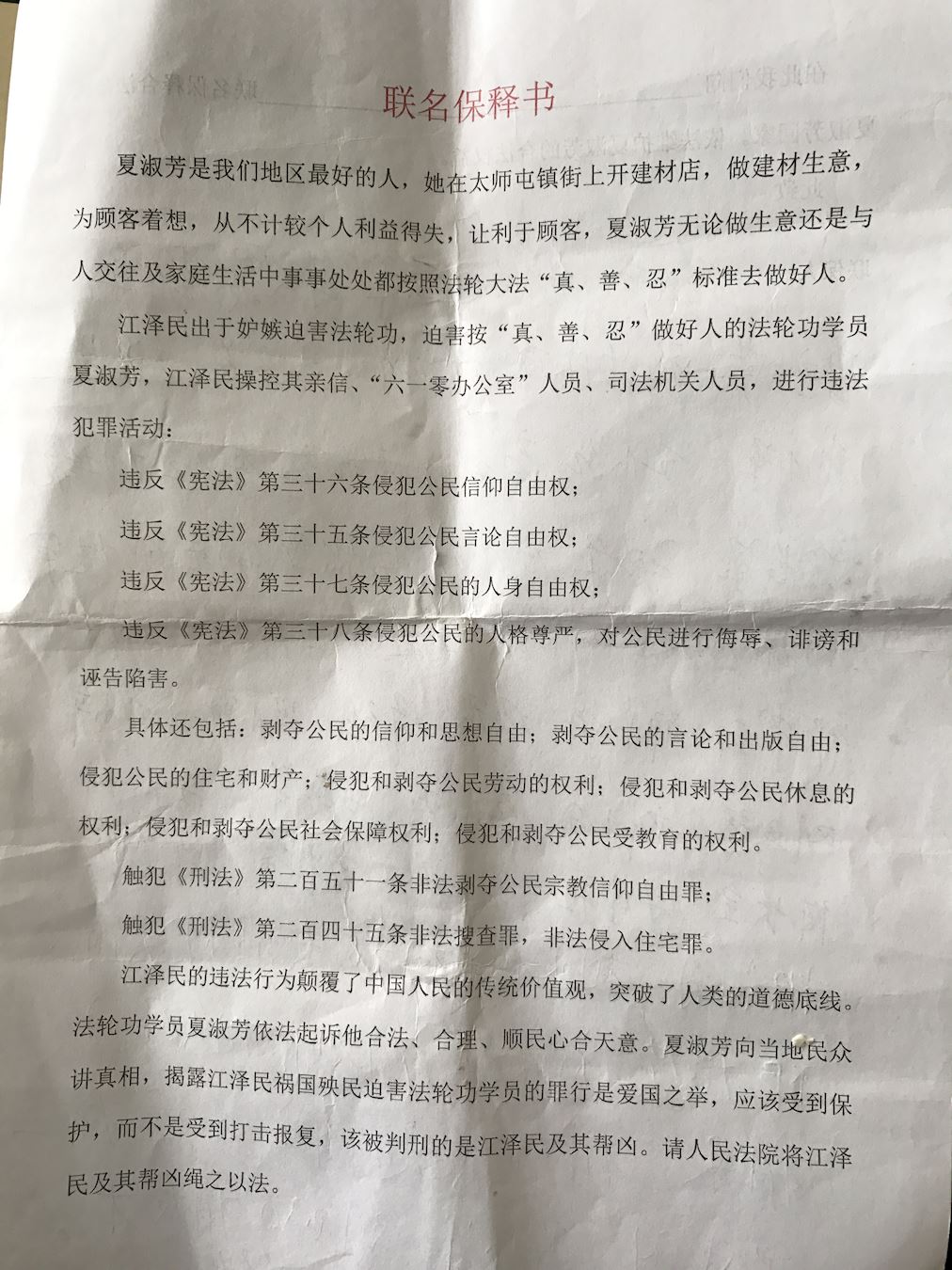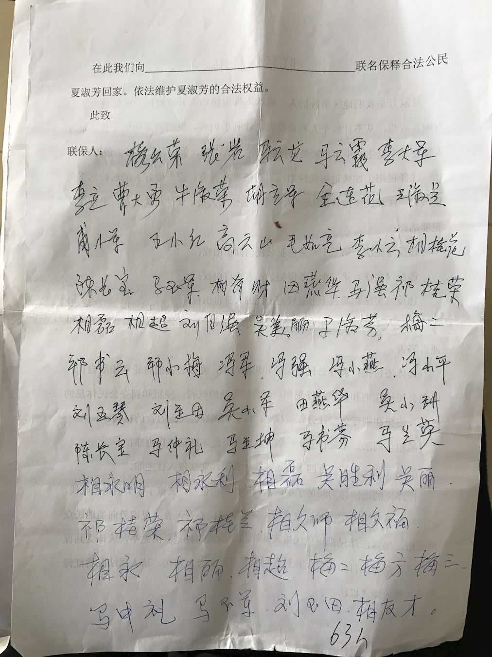 二零一七年二月份,当地一百五十名群众联名要求无罪释放她;二零一七年四月份增加四百零七人声援夏淑芳,要求无条件释放她。