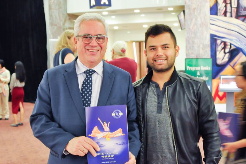图8:哥伦比亚驻新西兰总领事巴勃罗·安东尼奥·雷博耶鲁斯洛斯(Pablo Antonio Rebolledo Schloss 左)和儿子观看了神韵在奥克兰的演出