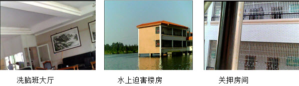 三水洗脑班在三水荷花世界附近的100亩的人工湖上,与广东妇女劳教所相邻。六栋现代化的两层楼宇建在湖面上,大门前有一条小河,进入大门就是与世隔绝,在这里,凄厉的喊叫也会消没在荒郊寂静中。