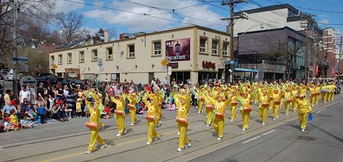 '图1~2:第五十二届多伦多湖滨复活节大游行中行进中的法轮大法腰鼓队'