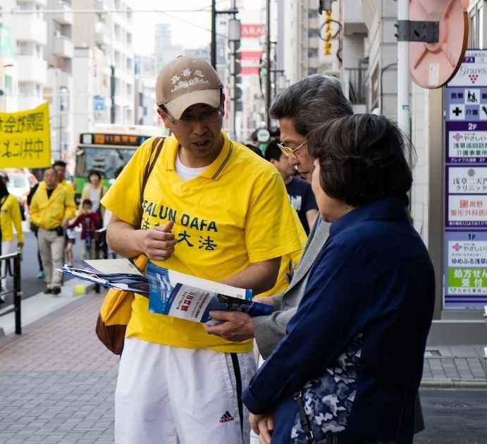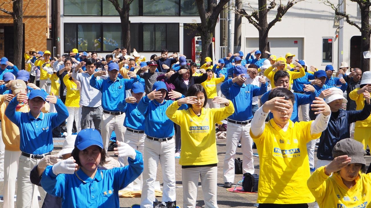 四月十六日上午,法轮功学员聚集在东京都墨田区花川户公园集体炼功,下午在浅草举行大游行。