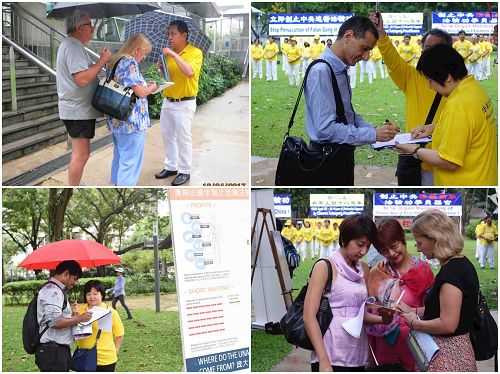 新加坡人丁先生一再询问中共为什么要迫害法轮功,听完学员的讲解后,他表示,迫害不应该发生,并签名支持反迫害。