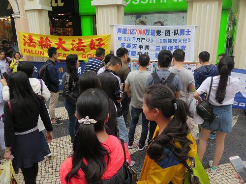 现值雨季,澳门这几天都风雨不停,早上仍下着雨,下午一直没雨,当活动在三点开始时,地上已经全干了。当澳门法轮功学员一打出写有 “法轮大法好”、“纪念法轮功学员四二五和平上访十八周年”、“声援两亿七千万勇士退出党团队”、“天灭中共”的大幅横幅时,大批民众立即聚集在图片和横幅前围观,看好了就离开,新的民众又围上来。在整个活动过程中,围观的人们一直没有减少。