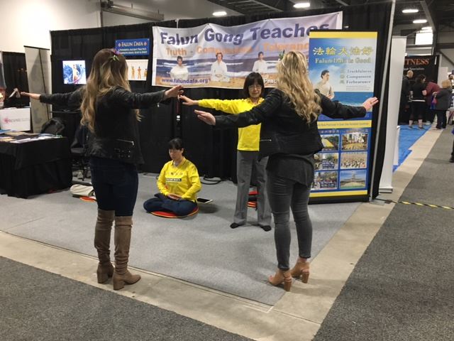 '图2:四月二十二日到二十三日,加拿大首都渥太华EY中心(EY Center)举办的身心健康展览上,民众学炼法轮功。'