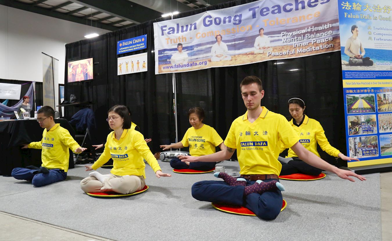 图2:四月二十二日到二十三日,加拿大首都渥太华EY中心(EY Center)举办的身心健康展览上,民众学炼法轮功。