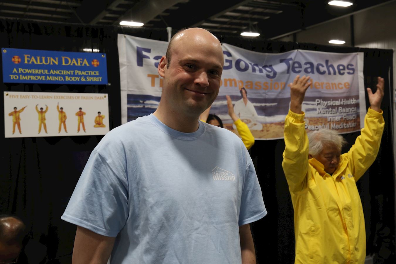 卡尔顿大学政治系学生Brent Royal多次在不同场合见到过法轮功。他同一天在另一个展会——“五十五岁(以上)生活方式”上也看到了功法演示。他说:“非常美,赏心悦目。每次看到法轮功学员的功法展示,我都会拍点照片。非常优雅、非常美好。法轮功有很多美好的精神内涵。这些美好的理念——真善忍,有谁会不认同呢?”