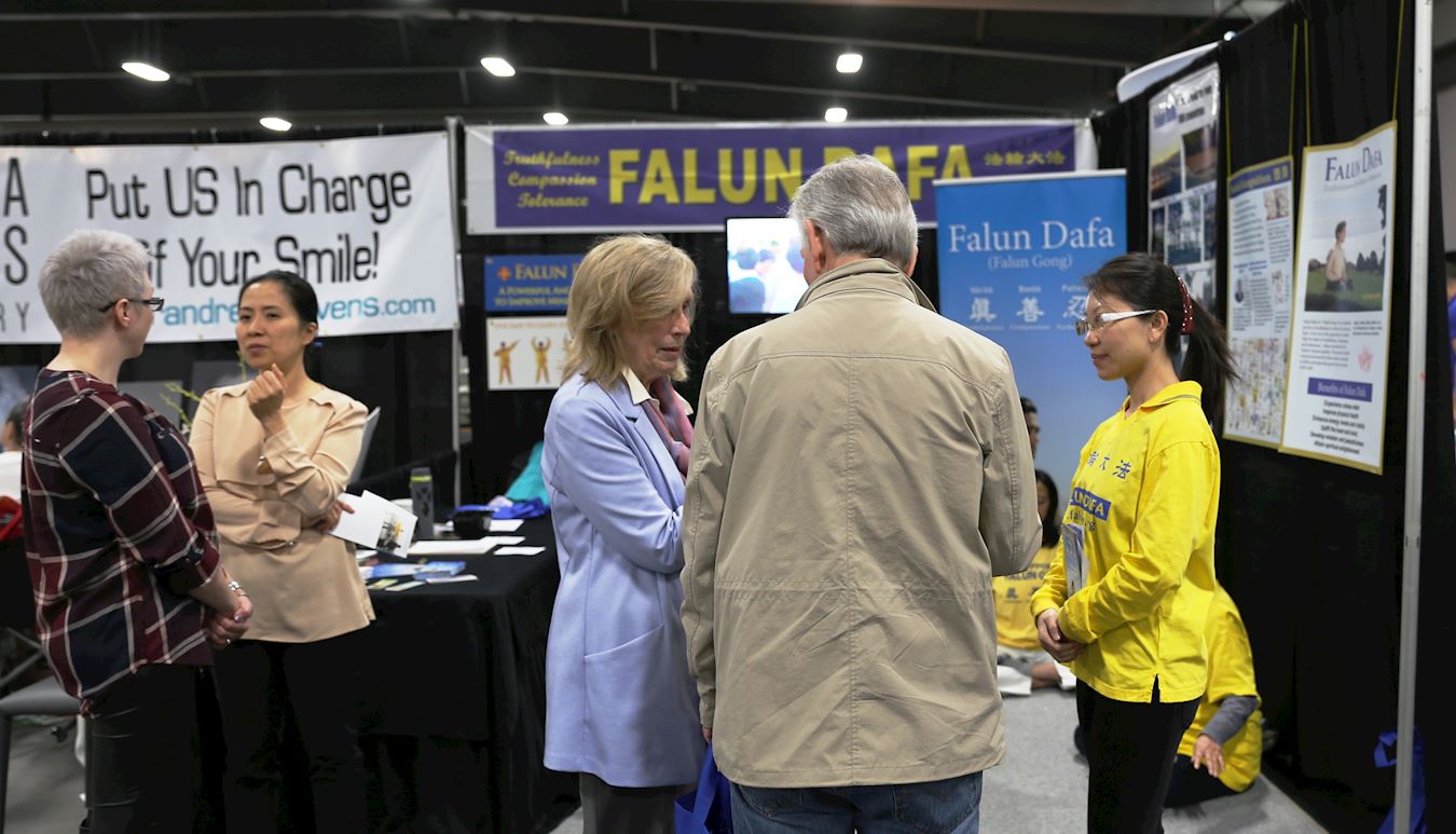 优雅、轻柔的炼功动作伴着祥和的音乐,法轮功五套功法展示时,散发出的纯净、慈悲的能量场吸引众多加拿大主流社会人士驻足观赏。老中青不同年龄层次,东西方不同族裔修炼人炼功时脸上展现的平和、圣洁,展位上悬挂的“真善忍”横幅,让人们深深感受到内心的愉悦和共鸣。