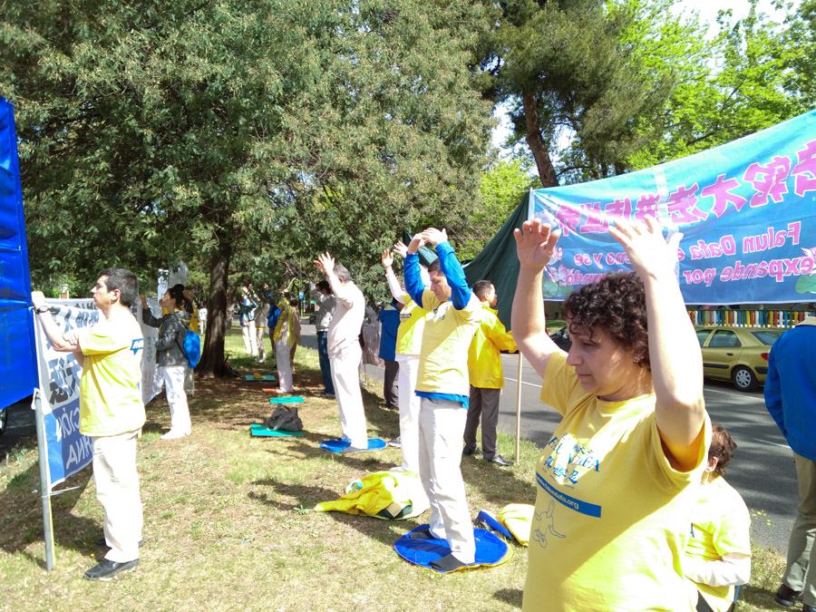 ![]() 图4:四月二十二日到二十三日,加拿大首都渥太华EY中心举办的身心健康展览上,法轮功学员演示功法 |