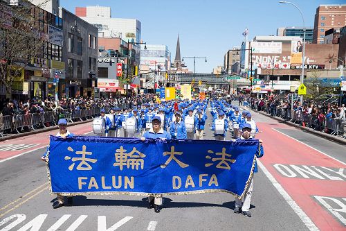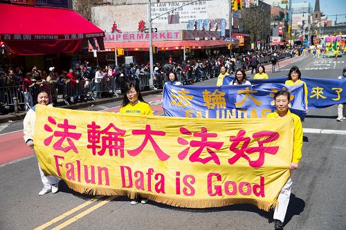 当天阳光灿烂,春风拂面,数以万计以华裔为主的各族裔民众,密密麻麻地驻足在法拉盛中心区街道两边,扶老携幼,争相目睹法轮功游行盛况。游行所到之处,民众纷纷举起手机拍照,记录下壮观的场面。不少观众高兴地鼓掌,开心地赞叹游行“很好看”、“很漂亮”。一路上都有民众伸长手臂,要法轮功学员派发的“法轮大法好”小莲花饰品。