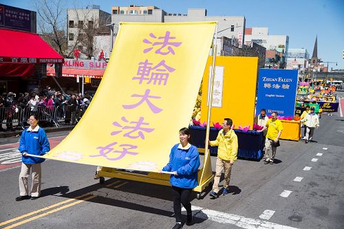 “法轮大法好”的大竖幅,中英文《转法轮》书的大模型,“法轮大法好”、“真善忍好”等几十个横幅鱼贯而行,这一刻法拉盛最热闹的缅街上是“法轮大法好”的海洋。法轮功学员站在精巧美丽的大花车上,在莲花宝座上演示法轮功五套功法,民众看得目不转睛。
