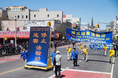 大游行于中午十二点开始,分为三大主题方阵:“法轮大法好”、“停止迫害法轮功”、“声援2亿7千万勇士退出中共党团队”。法拉盛最热闹的缅街上,游行队伍浩浩荡荡,一眼望不到头。