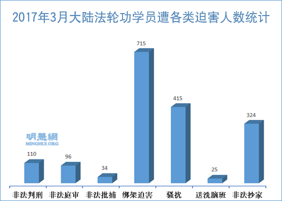 明慧网2017年3月份报道,被绑架迫害的法轮功学员715人,被骚扰的有415人,被非法判刑110人,被非法庭审96人,被非法批捕的34人,25人被关入洗脑班,324人被非法抄家。