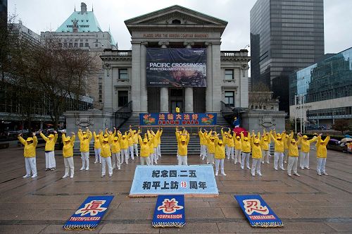 4月22日下午,温哥华法轮功学员在市中心艺术馆前举行大型法轮功功法演示和烛光守夜活动,纪念四二五和平上访十八周年。