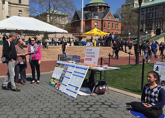 四月四日,哥伦比亚大学法轮大法学生社团在校园中心广场,开展了为期两日的讲真相活动,向学生、教师及各国游客展示法轮功功法,派发真相传单。
