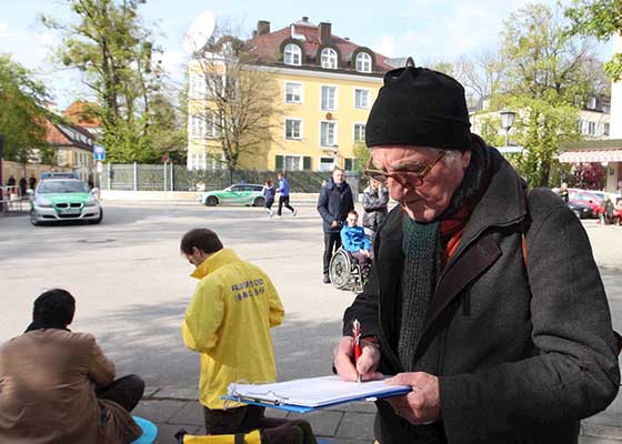 四月二十三日,法轮功学员在慕尼黑中领馆前举行了纪念四·二五和平上访十八周年、制止中共迫害法轮功以及揭露中共活体摘取法轮功学员器官罪行的活动。