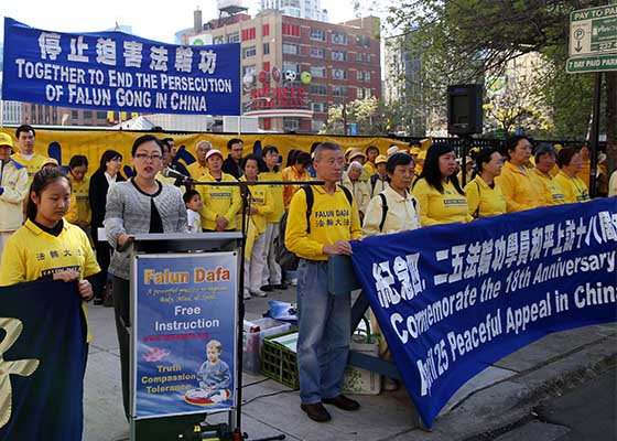二零一七年四月二十三日,法轮功学员在芝加哥中领馆前举行集会,纪念四·二五和平上访十八周年。