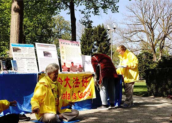 四月二十三日,瑞士法轮功学员在首都伯尔尼的玫瑰花园和苏黎世湖畔集体炼功,纪念十八年前的四月二十五日万名法轮功学员和平上访。