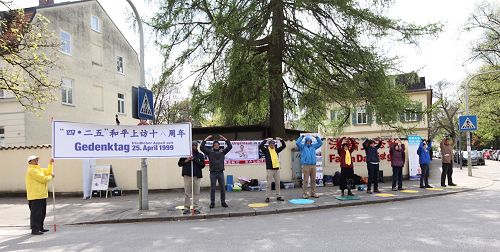 有一对路过的德国夫妇开始的时候不愿意接受真相资料、也不想听法轮功讲述真相,法轮功学员告诉他们这非常重要,他们一定得了解一下,于是他们停下脚步来仔细聆听,并提了很多问题,例如什么是法轮功、为什么中共要迫害法轮功等等,当他们最终了解到事实的真相之后,非常感动,不停地感谢法轮功学员让他们能有机会了解到中共迫害法轮功的真相。