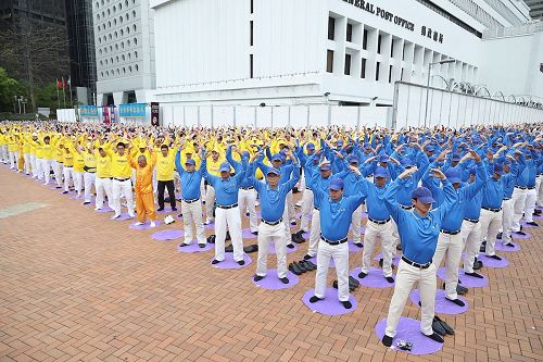 ![]() 图2~4:集会前的清晨上午,法轮功学员齐聚中环爱丁堡广场大炼功。 |