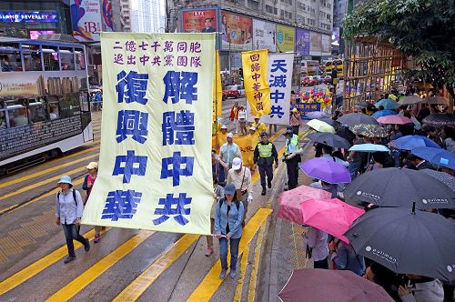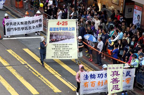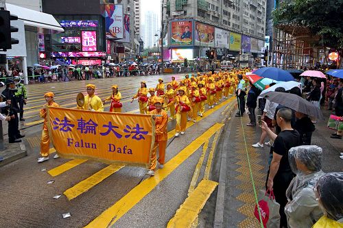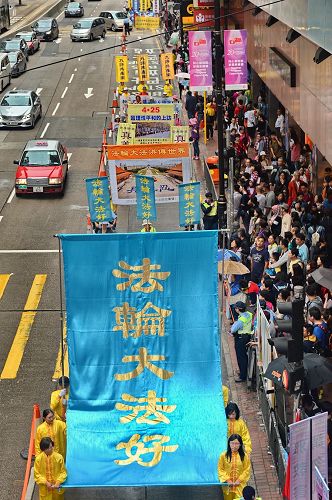 集会结束后,约一千二百名法轮功学员组成游行队伍,于下午二时,在天国乐团演奏雄壮乐曲的带领下,从北角英皇道游乐场起步,沿着港岛多个闹市游行至中联办。各式幡旗、横幅、展板上鲜明的真相,振奋人心的腰鼓队、旗鼓队,在吸引沿途市民与游客关注必驻足观看,不少人拿起手机拍摄游行画面,表示要带回去与亲友分享。