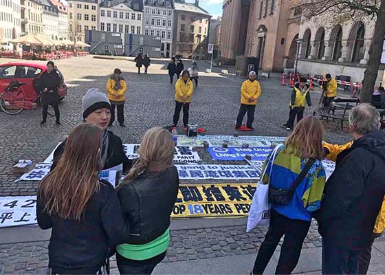 四月二十二日,丹麦法轮功学员来到哥本哈根市中心的新广场弘法,向民众讲述法轮功的真相。