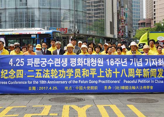 四月二十五日,韩国法轮功学员在中共驻韩大使馆前召开记者会,纪念四二五和平上访。他们向世人讲述法轮功遭迫害真相的同时,要求中共停止迫害法轮功。
