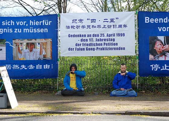 四月二十五日,部份来自德国北部地区的法轮功学员在汉堡中领馆前举行了纪念四·二五和平上访的活动。