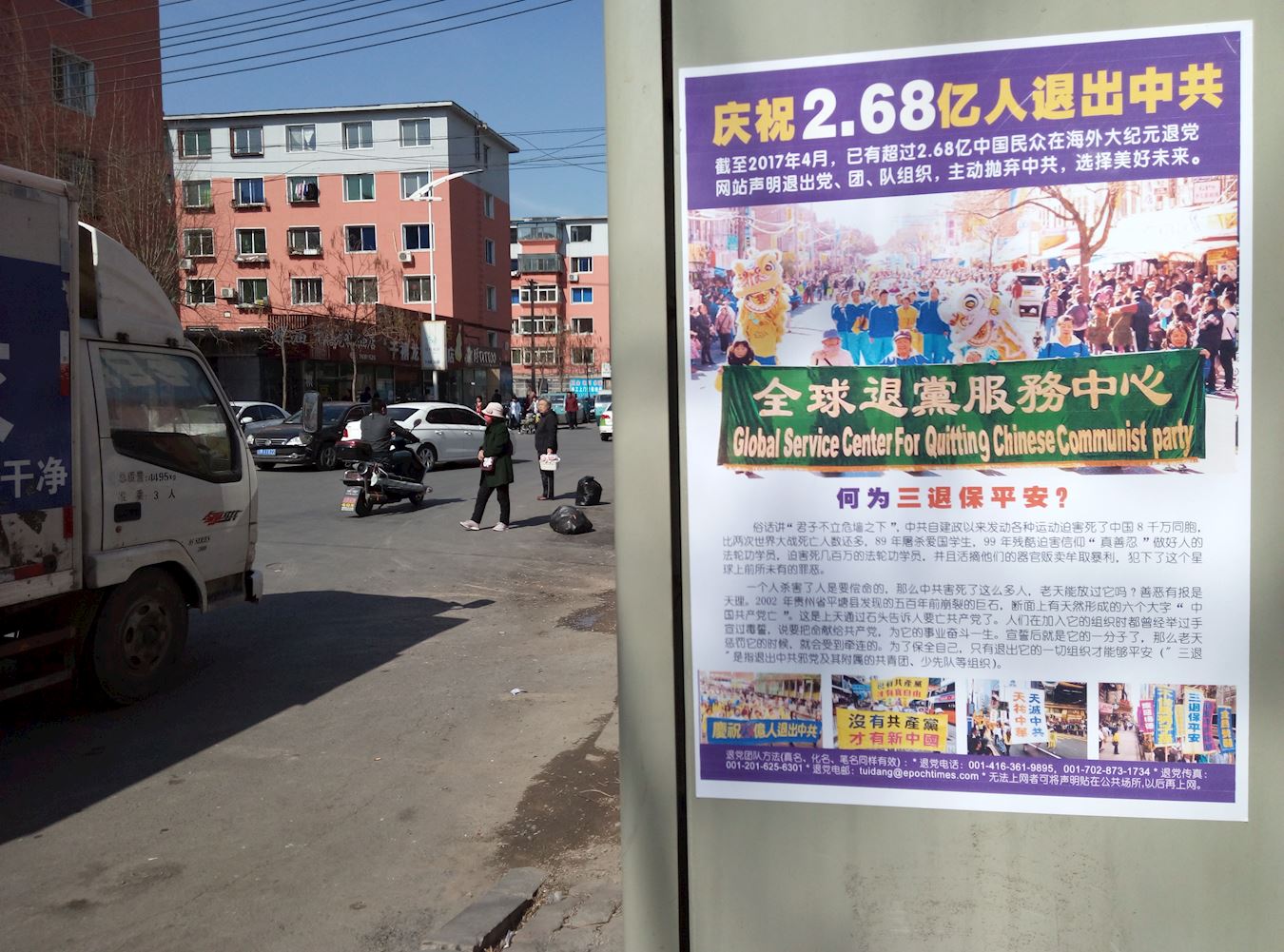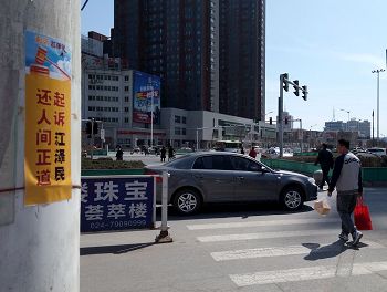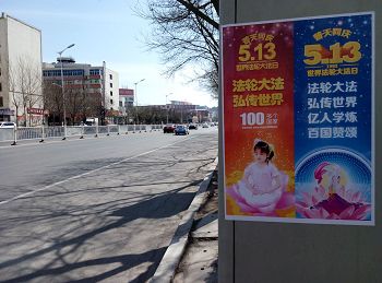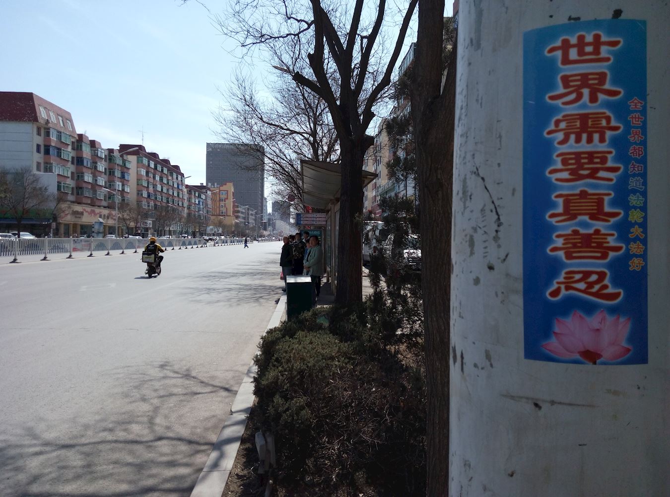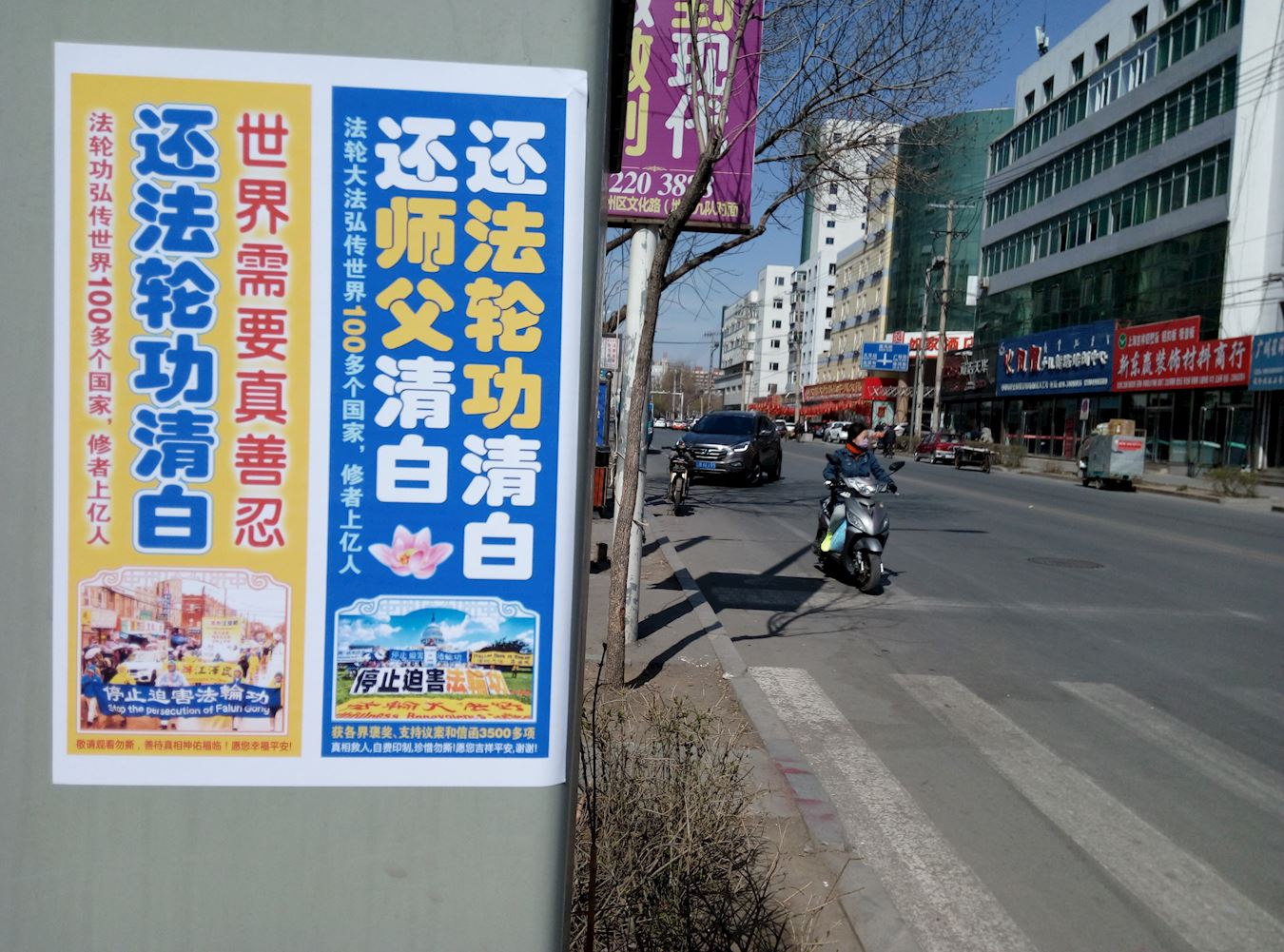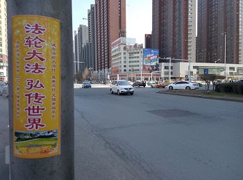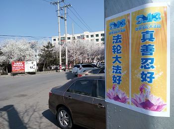 四月的铁岭桃树已经开花,柳树也刚刚发芽。“法轮大法好”“真善忍好”粘贴及“法轮大法”洪传世界和“513”大法日,三退保平安,法办江泽民,还法轮功清白等信息在铁岭的大街小巷广泛传播。
