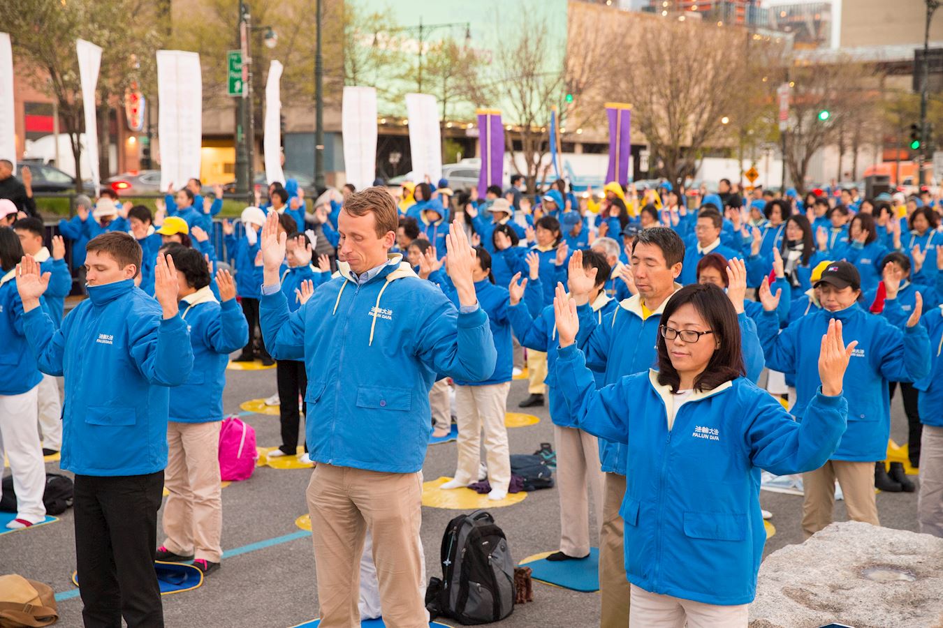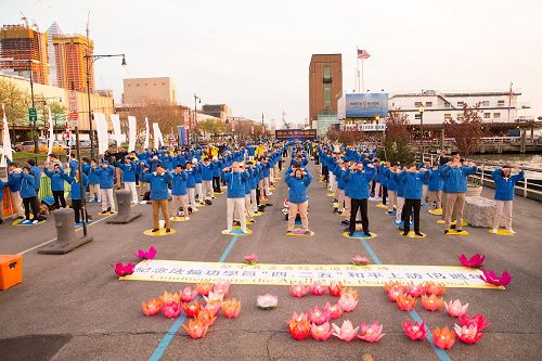 图1~3:二零一七年四月二十三日傍晚,纽约中领馆外,哈德逊河边上,音乐响起,不同年龄、不同族裔的近千位法轮功修炼者,在祥和缓慢的炼功音乐中演示法轮功五套功法。