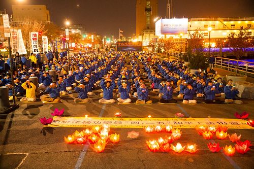 图4~7:夜色降临,学员们点起盏盏烛光,轻轻举过头顶,表达对那些在中共十八年的残酷迫害中,被迫害致死的法轮功修炼者的缅怀,同时呼吁尽快结束这场迫害。