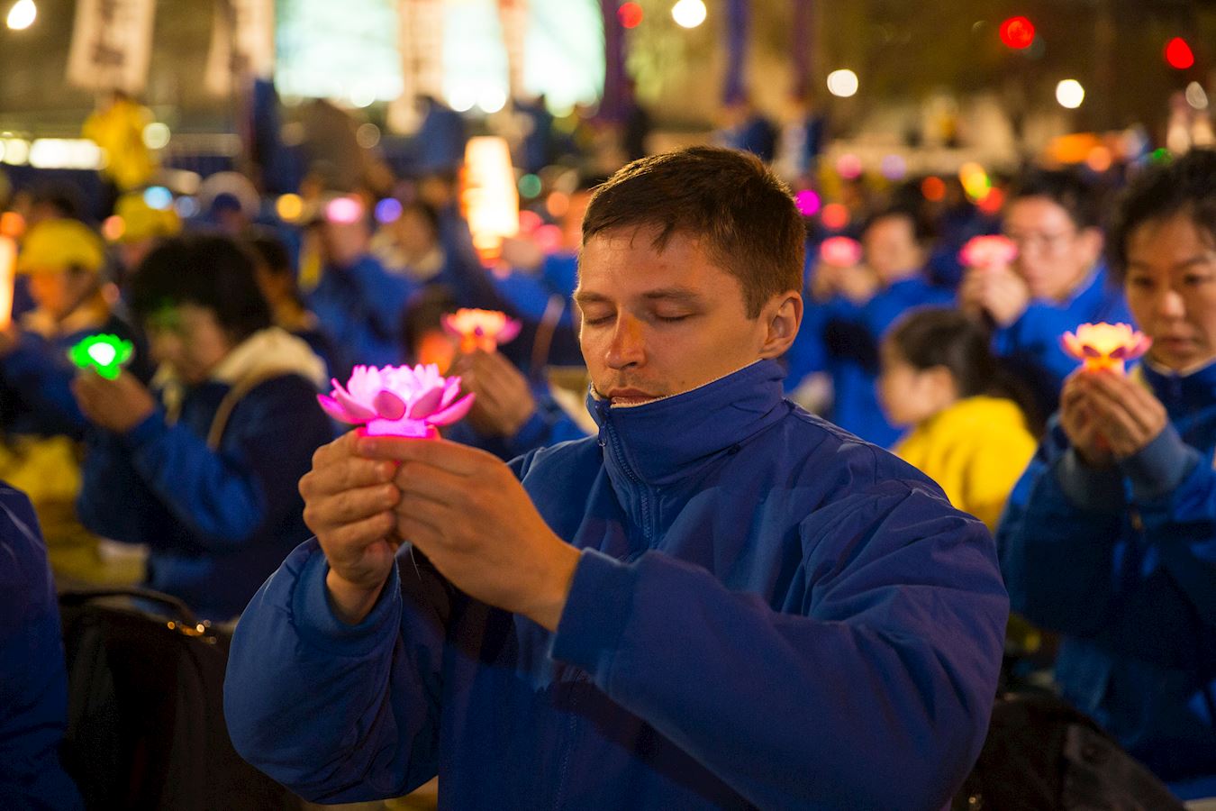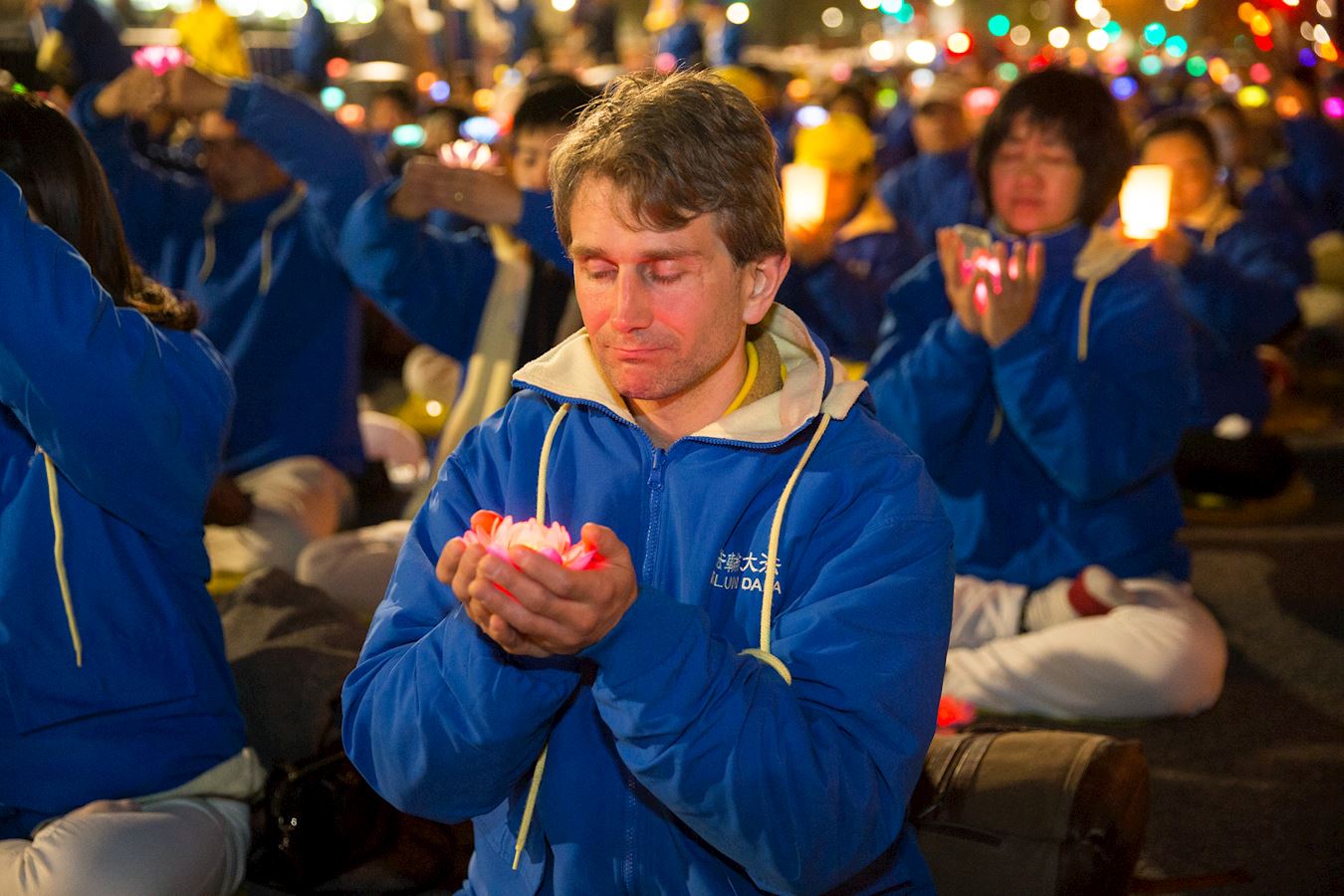 夜幕下,一盏盏烛光被点亮,被学员们举过头顶,捧在胸前,纪念着那些被中共迫害致死的法轮功修炼者。