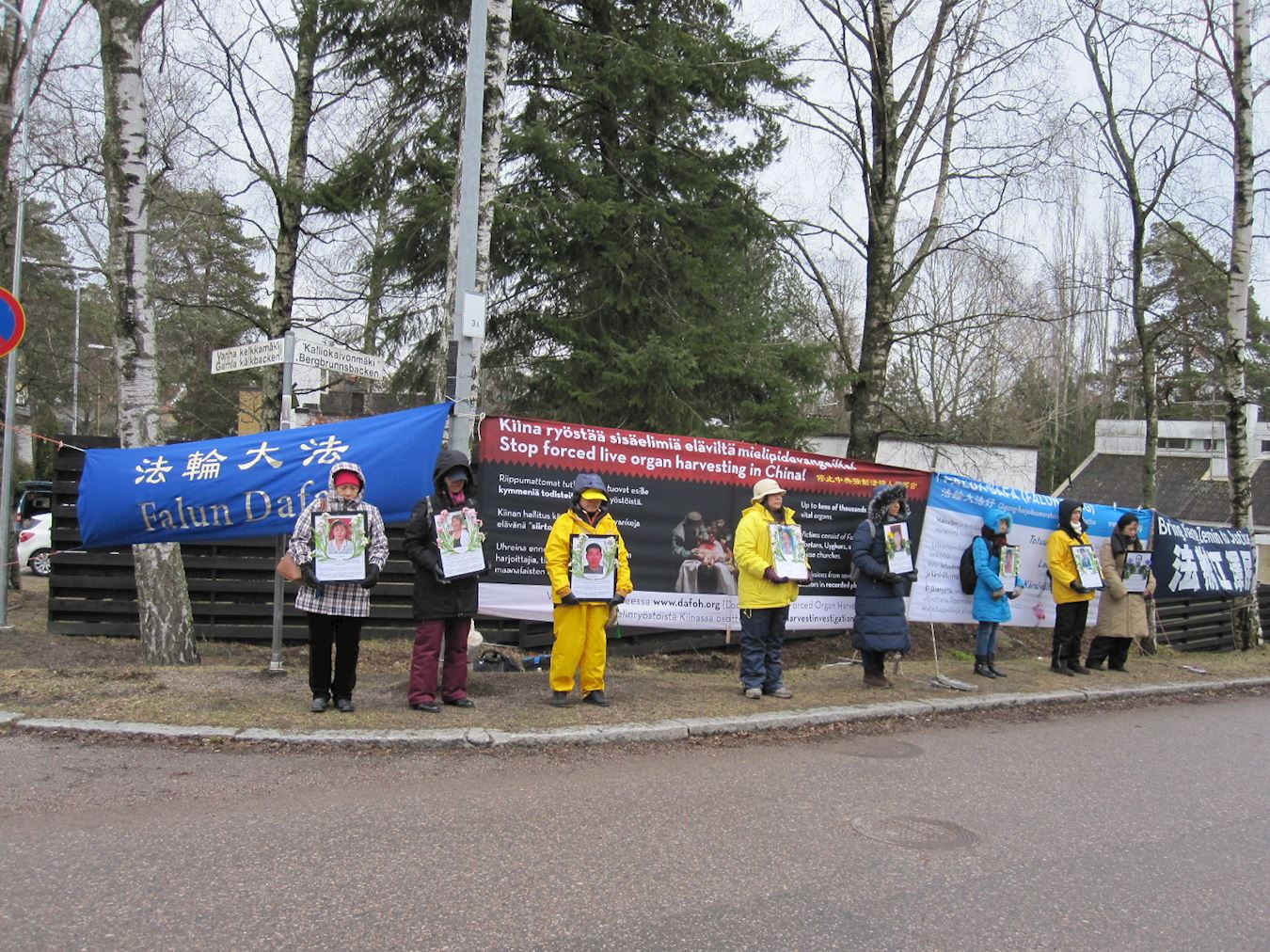 抗议地点因是交通要道,来往车辆络绎不绝。法轮功学员在马路两侧打出“按一下喇叭,为制止迫害法轮功”的牌子,不时有司机减缓车速,看到大横幅上的内容后,或者按喇叭,或者冲学员伸出大拇指。从早晨六点开始,长长短短的汽车喇叭声传进中领馆,表达人们对中共罪行的厌恶,同时提醒里面的人正视门外的抗议。