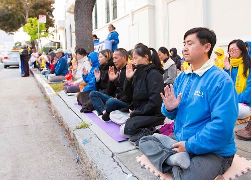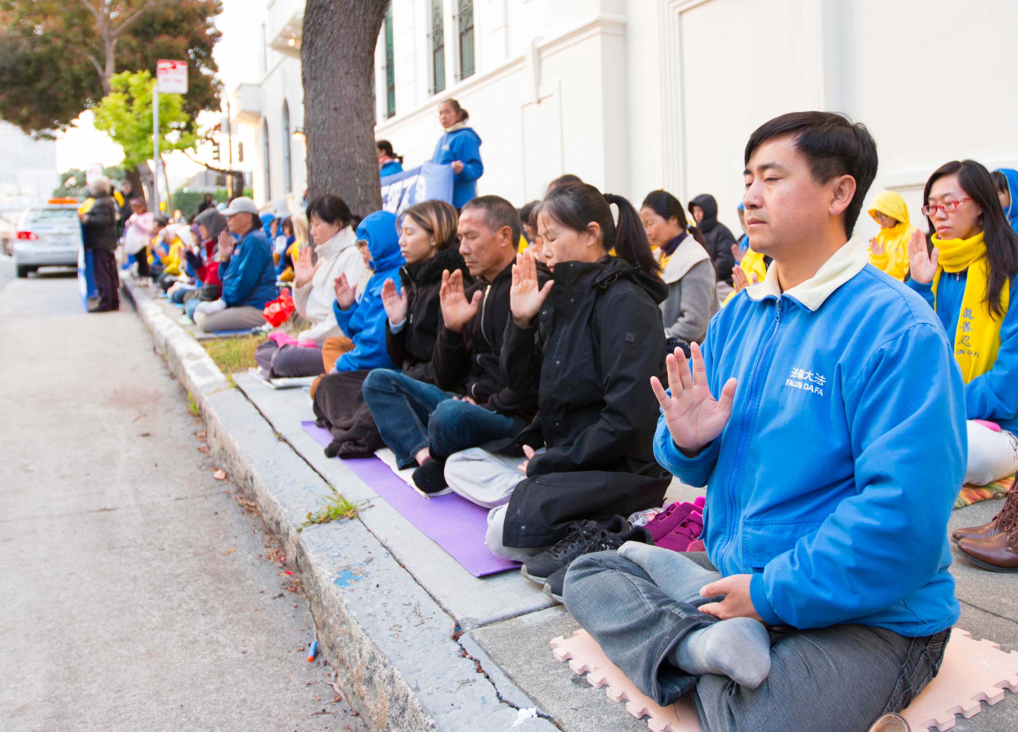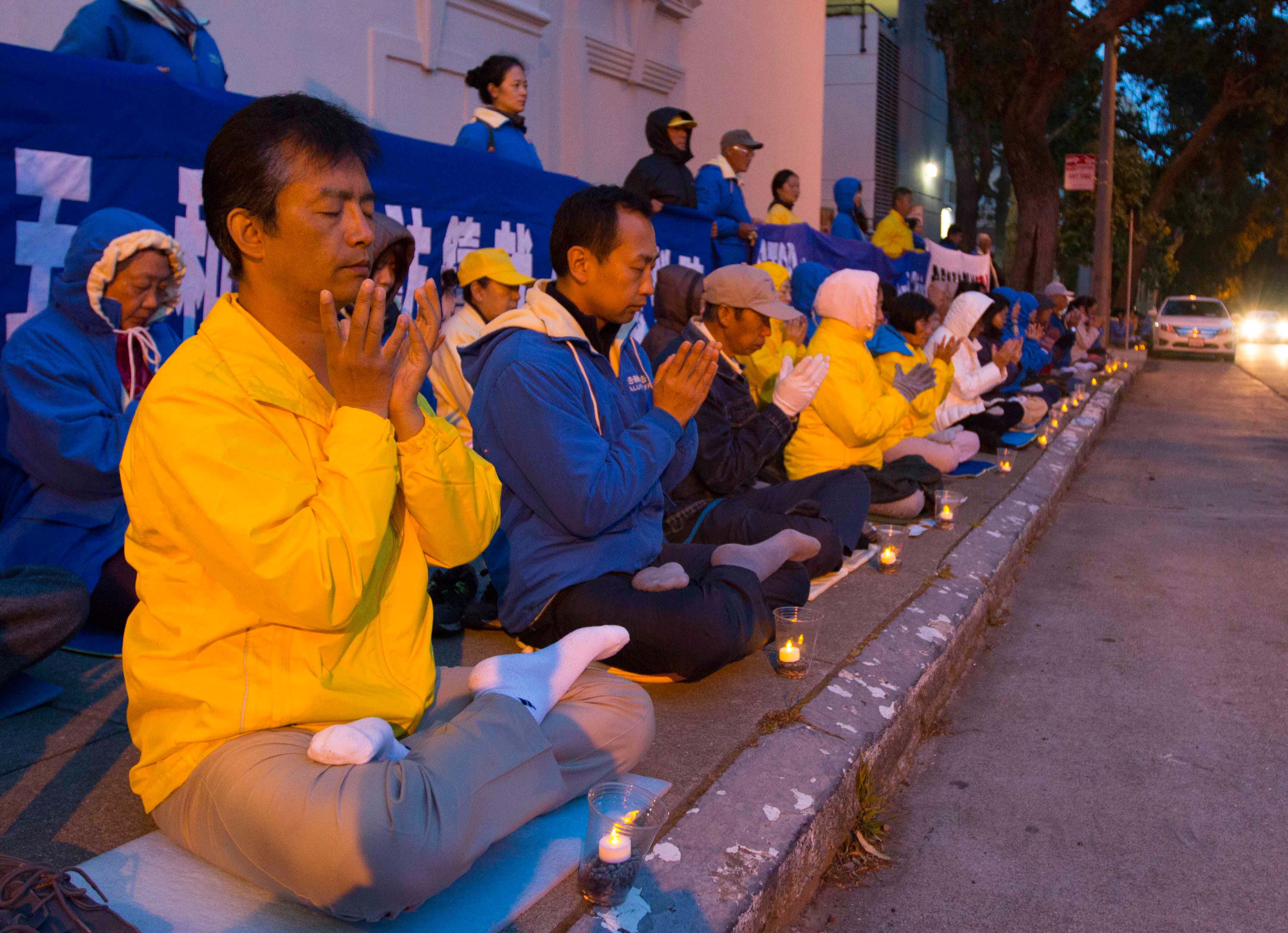 【明慧网二零一七年四月二十六日】(明慧记者王英旧金山报导)二零一七年四月二十四日傍晚,旧金山湾区的法轮功学员,在中共驻旧金山总领馆前烛光夜悼,纪念四•二五中南海和平上访十八周年,悼念十八年中因信仰而被中共迫害致死的无数法轮功学员,呼吁解体中共,彻底结束对法轮功长达十八年的残酷迫害。