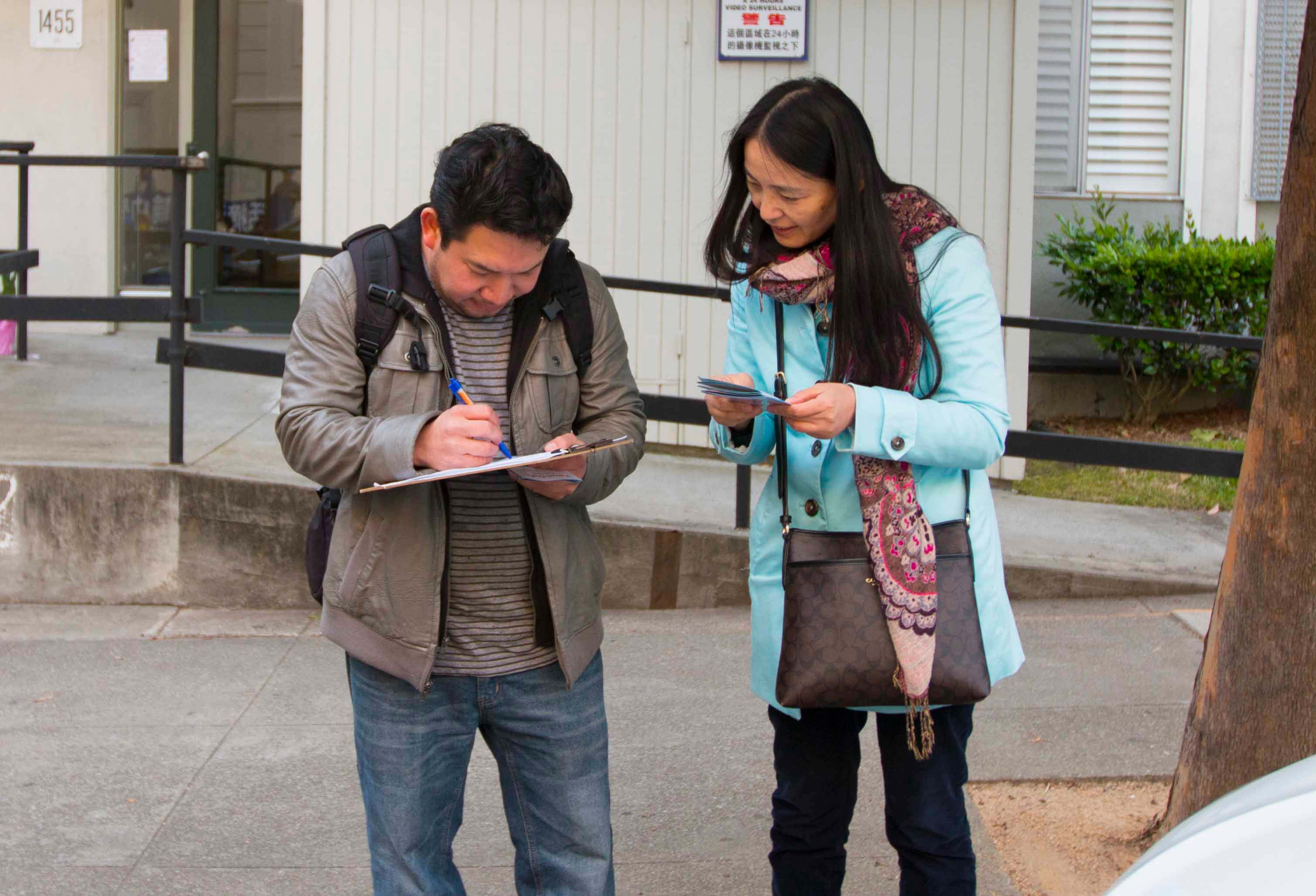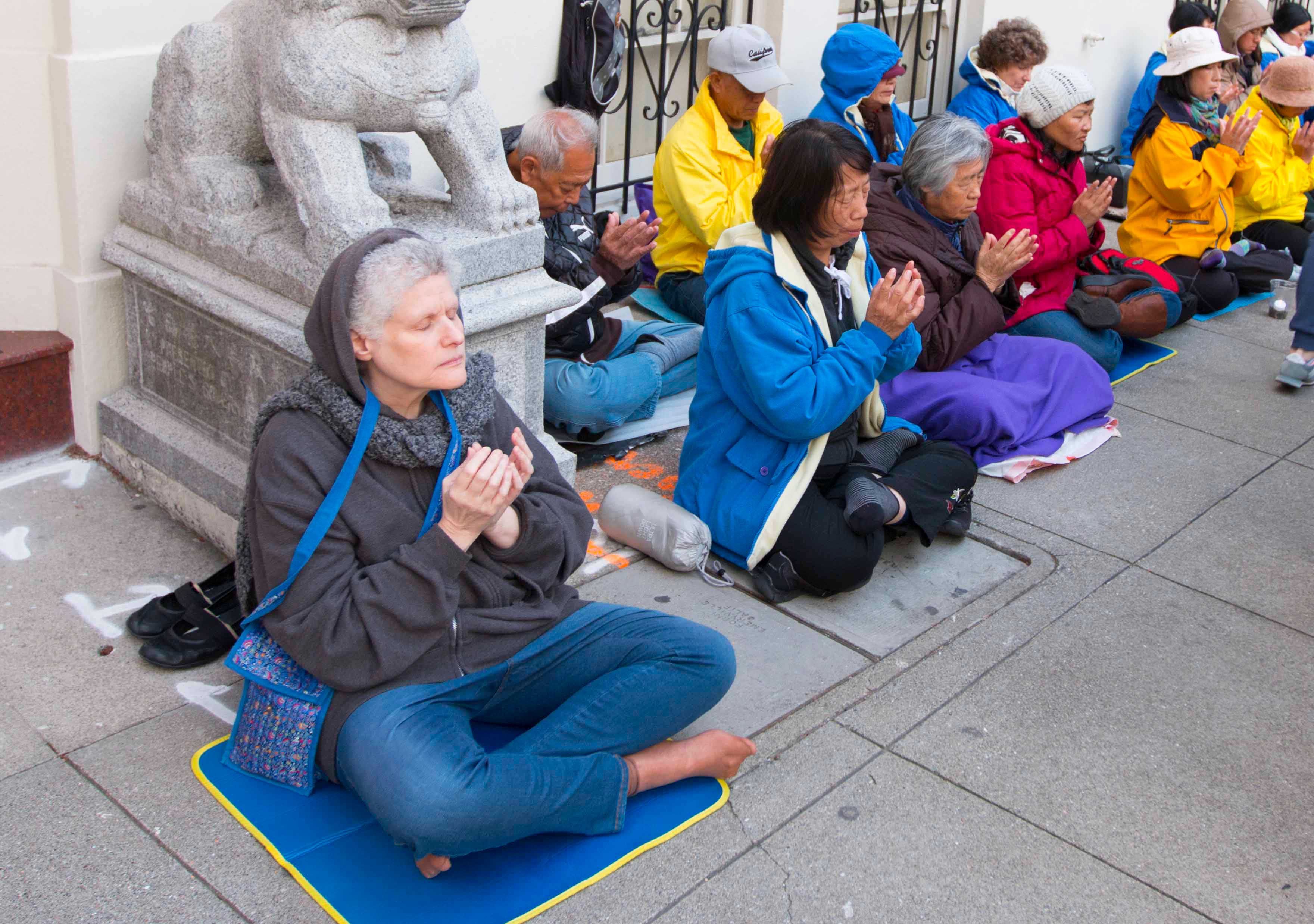![]() 图10:旧金山居民Iris Perla与法轮功学员一起请愿 |