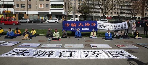 ![]() 图1:德国北部地区法轮功学员连续抗议十八小时,纪念十八年前的四二五和平上访 |
