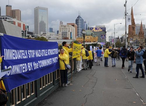 四月二十五日,墨尔本法轮功学员冒雨在市中心举行了“真相长城”和烛光夜悼活动,纪念“四二五”万人和平上访十八周年。