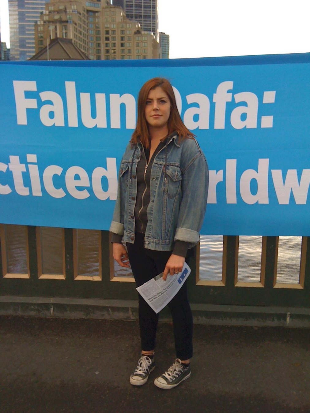 英国游客哈里森(Amy Louise Harrison)女士走过王子桥上的“勇气长城”,她表示:“法轮功受迫害真是千古奇冤。因为法轮功学员相信‘真、善、忍’,他们遵循的是正确的,所以他们勇敢。他们传递了光明向上的信息,如仁爱、忍耐与尊敬。人们都会被感动。我在泰国也见过法轮功学员讲真相,呼吁人们签名制止迫害,做得很棒。”