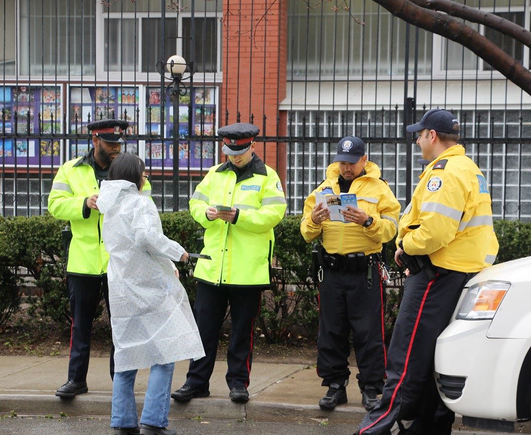 图9:在活动现场冒雨执勤的一队警察对法轮功学员的活动非常赞赏,警察表示知道今天的日子,还说我们是来保护你们的。
