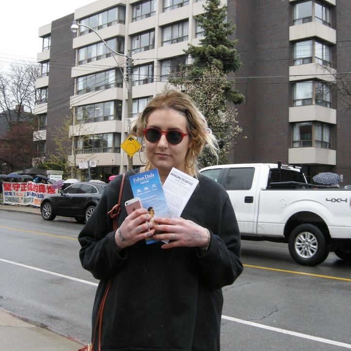 Devon Murray女士是乔治布朗学院(George Brown College)的大学生,从活动现场经过,她在现场逗留了很长时间,她说:“法轮功学员秉承‘真善忍’法理去为人处事,他们没有伤害任何人,所以他们不应该被迫害。法轮功学员应该有信仰自由,那些活摘法轮功学员器官的人应该被关在监狱里度过他们的余生。”