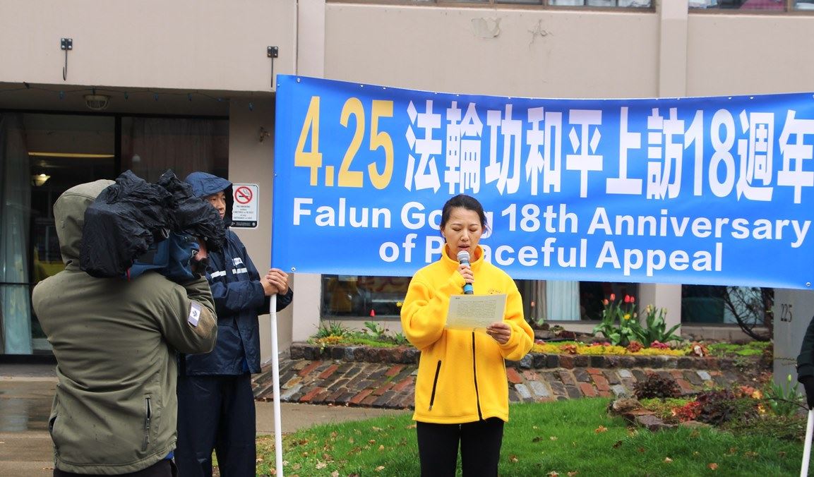 在中领馆前的新闻发布会上,亲历4.25和平上访的法轮功学员黎女士发言说回忆了十八年前的上访活动,“虽然人很多,大家都静静地站着,没有人大声说话。我们让出人行道、胡同口,前后分成4、5排,前两排同修站立,后面的同修就席地而坐,大家有的带着的大法书,或随身听学法,后排有些人炼静功。”她说,“没有人喊口号,没有人喧哗,也没有标语。”黎女士说,大家等到了晚上九点多,知道在天津被抓的学员已经释放后,开始离开现场。走时同修又捡起周边的纸屑,因为全天一直有学员收垃圾,所以地上几乎什么都没有。