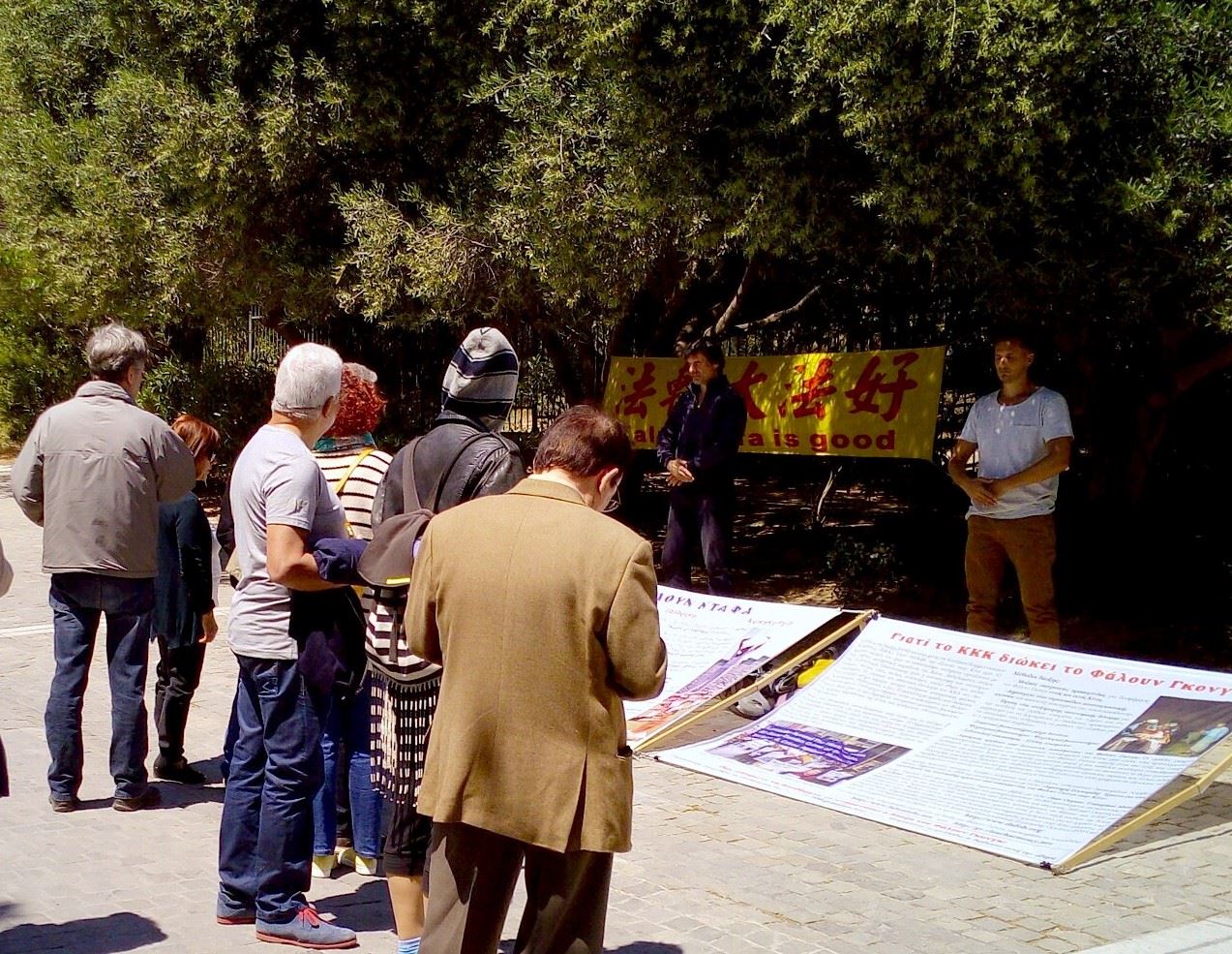 图1~2:在希腊著名旅游景点Acropolis,游人驻足了解法轮功真相