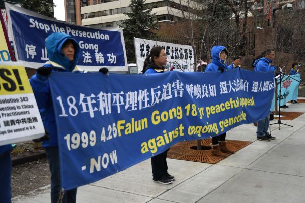 '图1~2:卡尔加里法轮功学员在中领馆前集会,纪念“四·二五”和平抗争十八周年。'