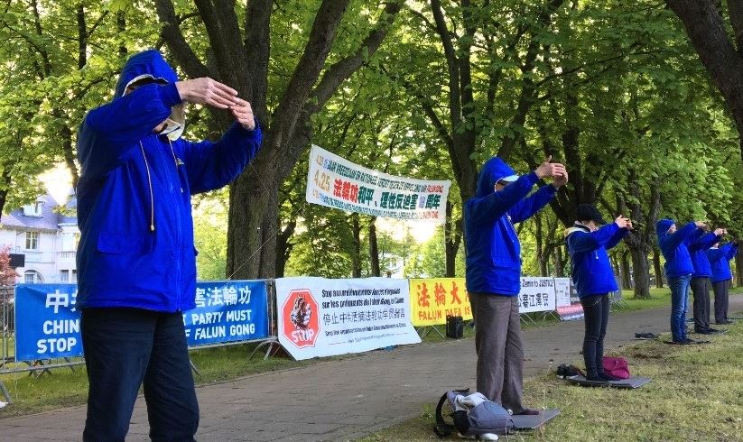 清晨,比利时学员来到中领馆前,随着悠扬的炼功音乐,集体炼功。一路排开的 “纪念四二五法轮功和平理性反迫害十八周年”、“法轮大法好”、“停止迫害法轮功”等十几个横幅,清晰地表达了他们的呼声。学员们还向路人发放法轮功真相传单。希望世人了解法轮大法好,法轮功十几年坚持反迫害的真相。