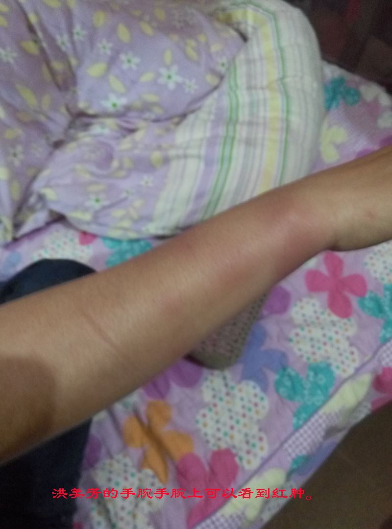 法轮功学员洪美芳回到家后,发现自己身上多次黑青。