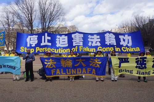 【明慧网二零一七年四月五日】在美国总统川普即将在佛罗里达州会见习近平前夕,来自华盛顿特区、纽约等地的部份法轮功学员在白宫前集会,呼吁结束中共政权对法轮功学员长达十八年的迫害,并法办迫害元凶江泽民。