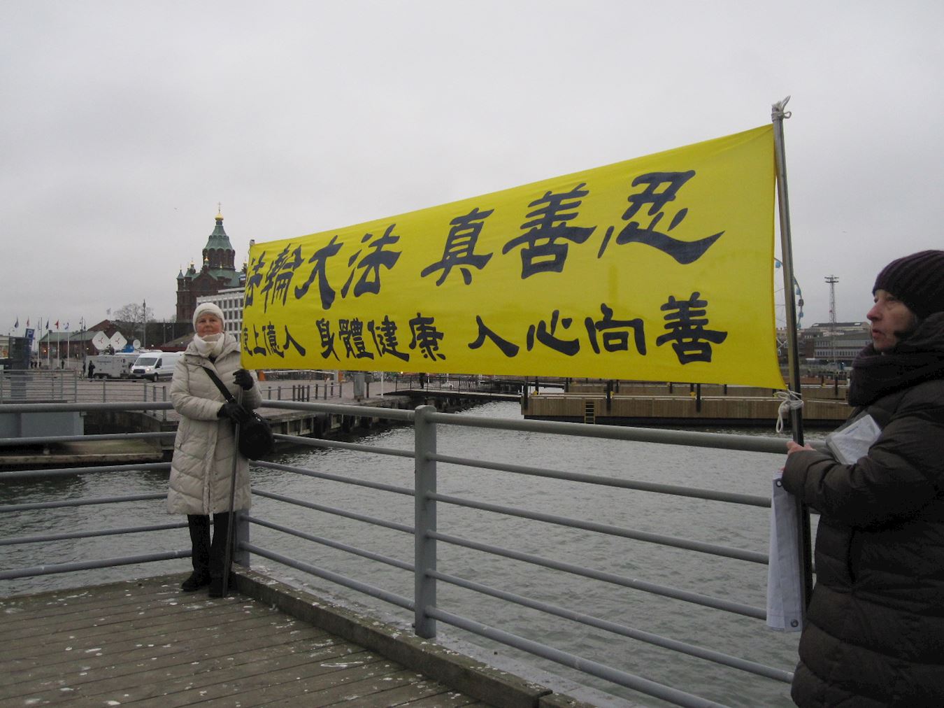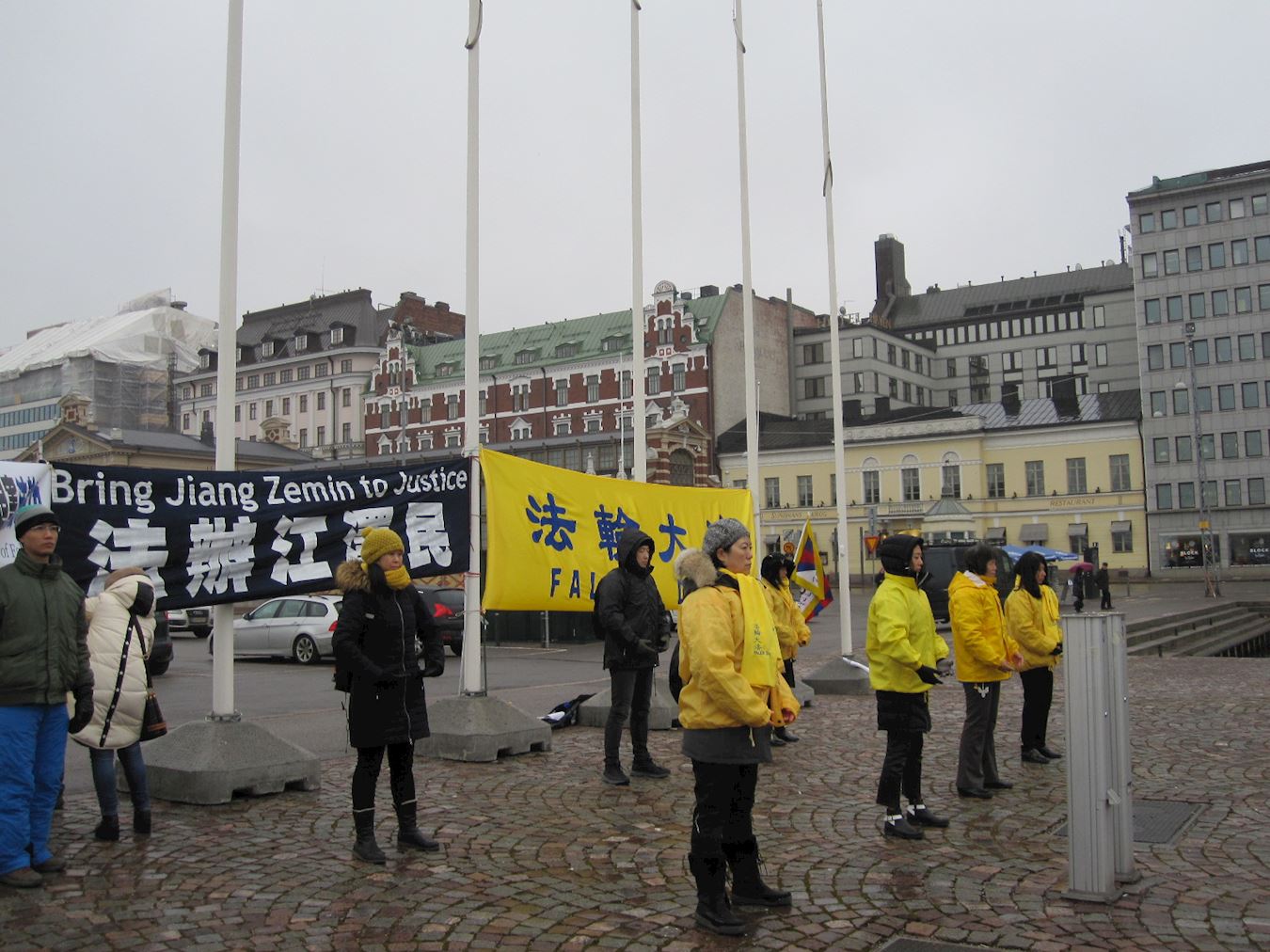 当天天空一直下着雨,法轮功学员们仍借此机会,坚持在总统府附近以和平理性的方式,打出“法办江泽民”和“停止迫害法轮功”等横幅进行抗议。