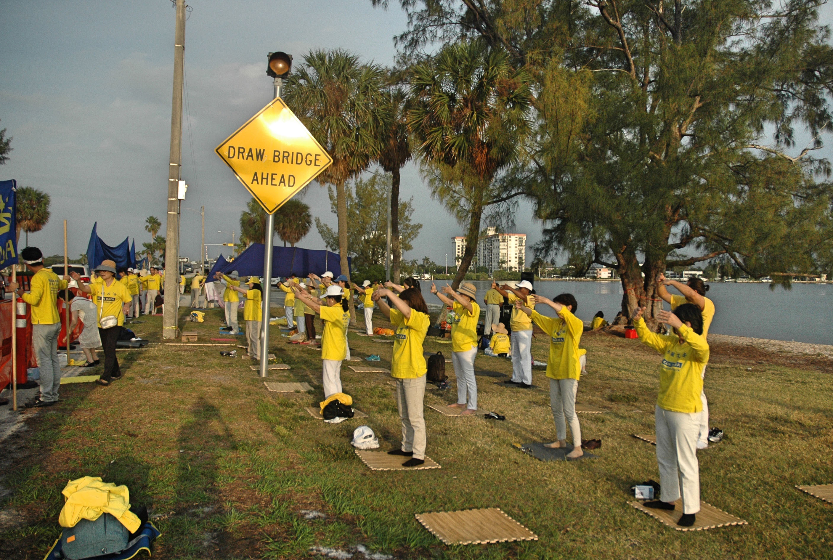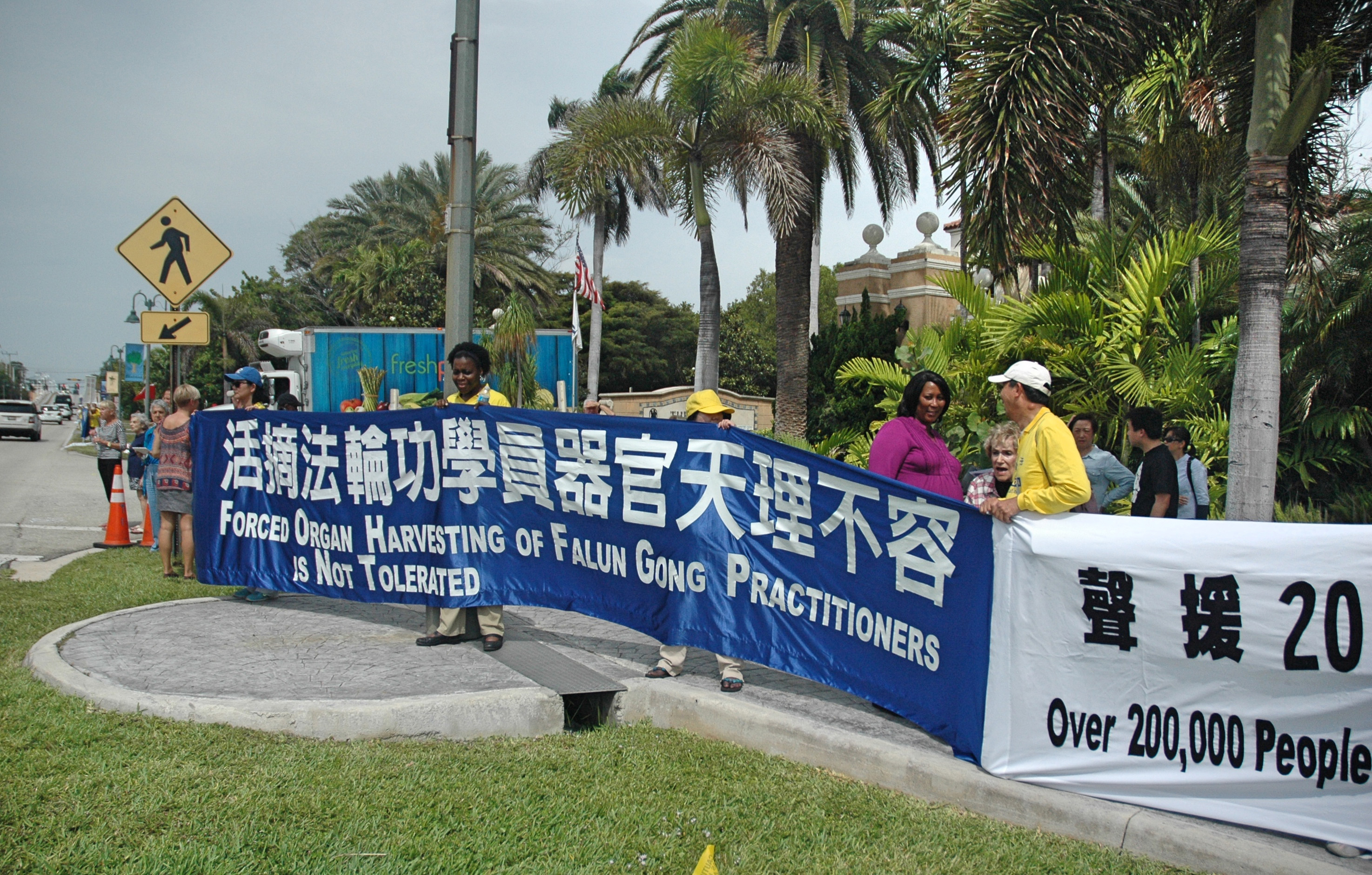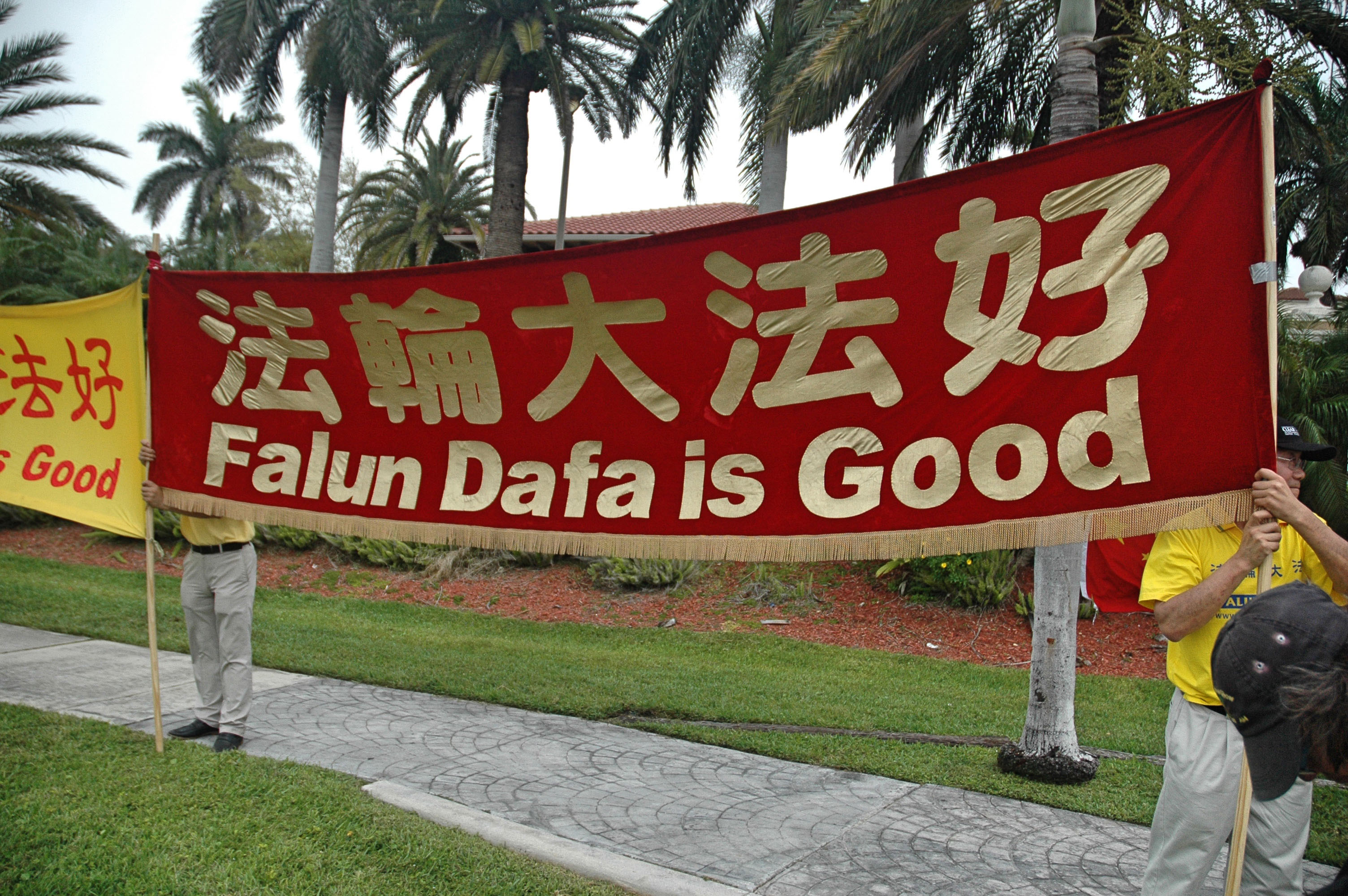 当天,法轮功学员在习近平入住的旅馆外,川普的马拉戈庄园,及沿途和平请愿,有的演示法轮功功法,有的打出“法轮大法 真善忍”,“法轮大法好”,“停止迫害法轮功”,“法办迫害元凶江泽民”等横幅,习近平的车队从法轮功学员的横幅前经过,习近平本人清楚的看到了“法轮大法好”,“世界需要真善忍”和“法办江泽民”的横幅。